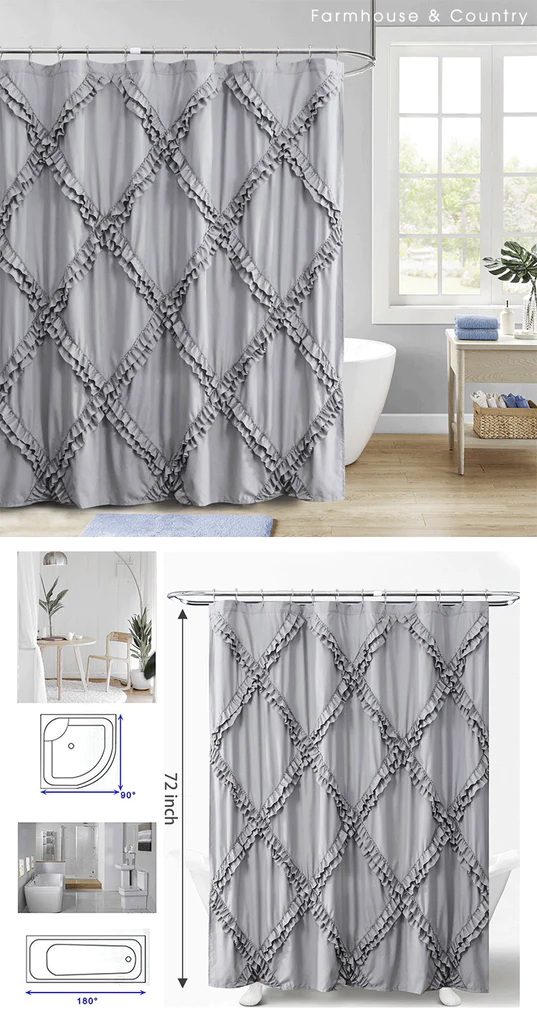 Introducing the ultimate shower curtain! Featuring a double ruffle design, diamond pattern. This spa-like shower curtain brings French country charm to your master bath or powder room.