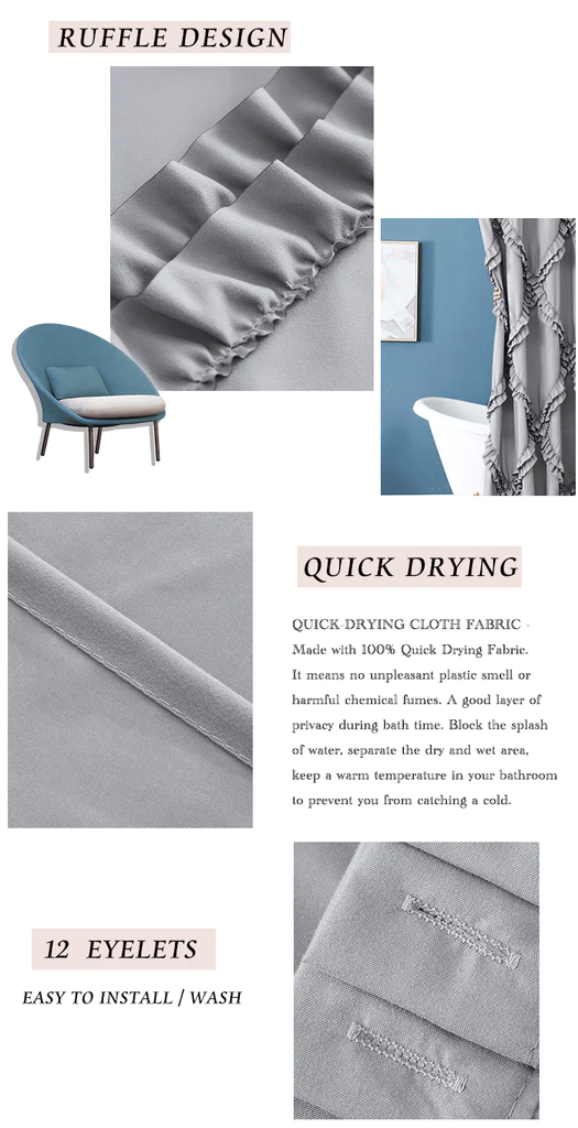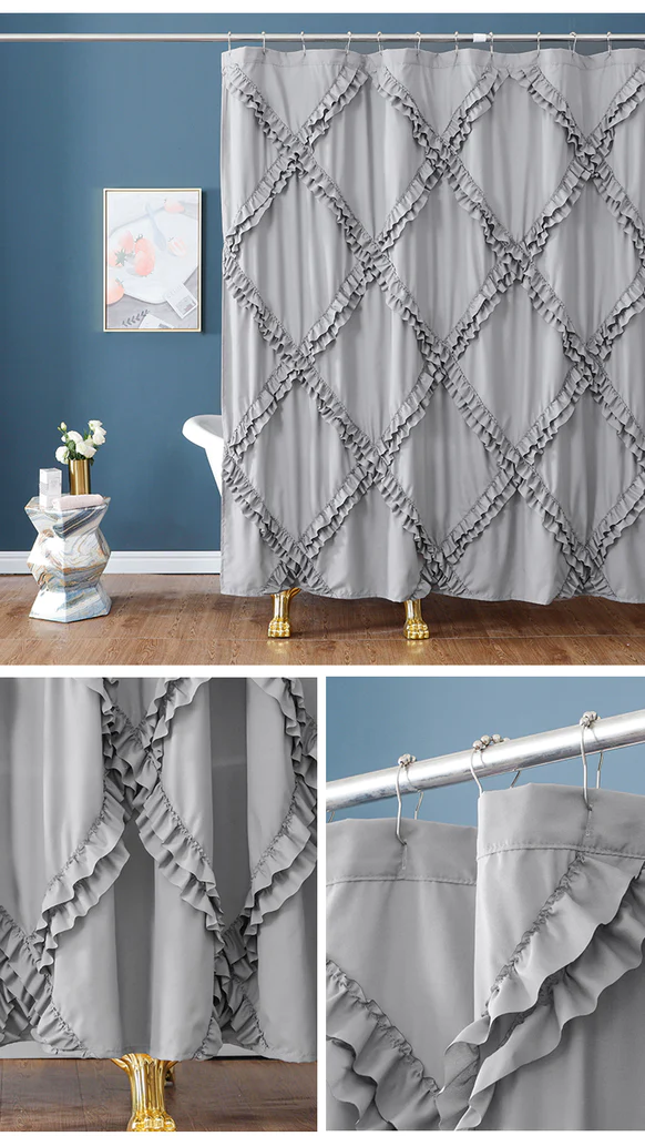 • UNIQUE STYLY - Compared with traditional shower curtains, our shower curtains are featuring double ruffle design, diamond pattern which is sure to compliment any bathroom setting or bathroom color scheme, and it can also decorate the room as a work of art.
