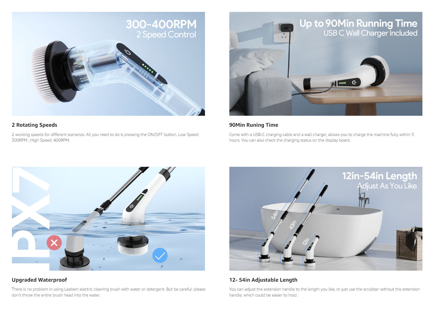• 【12-54in Detachable & Adjustable Mop】Leebein shower scrubber helps you get rid of laborious household cleaning, put the telescopic extension rod on and it will allow you to adjust the length of the spin scrubber from 12 inches up to 54 inches, which can help you clean the hard-to-reach places without bending and kneeling. Saving your back and knees by saying goodbye to the traditional clean way.