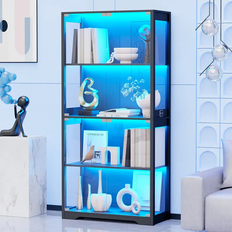Glass door display cabinet, four-layer collectible bookshelf with three-color lighting, suitable for toys, books, utensils, black, white and gray