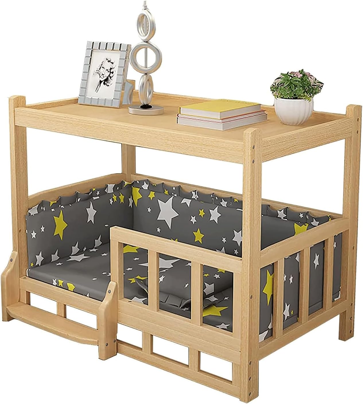 Pet Bed Wooden Dog Bed Frame Double Layer Elevated Dog Beds with Mattress Elevated Cooling Dog Bed Dog House with Railing (60x38x60cm)