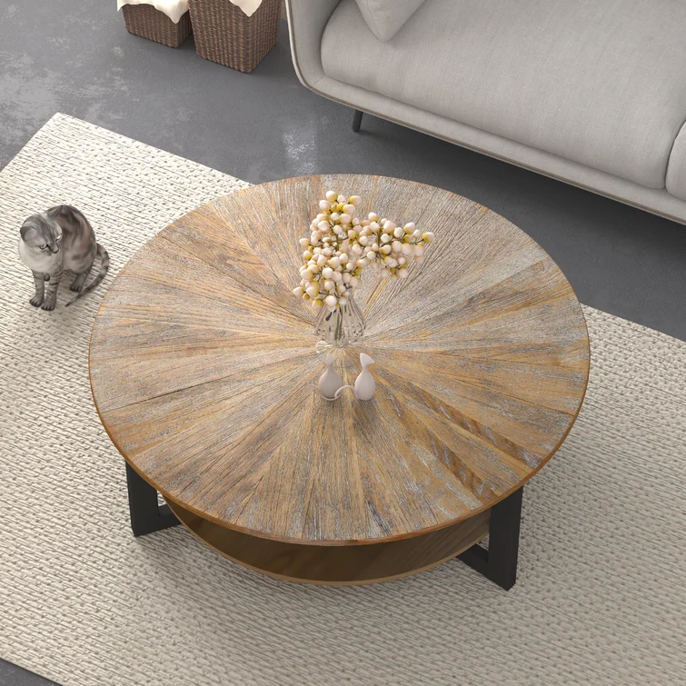 Hand-made umbrella pattern solid wood tabletop, thick metal framing, storage shelf addition, the farmhouse style round coffee table will meet your aesthetic and add decor for your home No matter whether your living room is simple or luxurious, it is always the best choice.