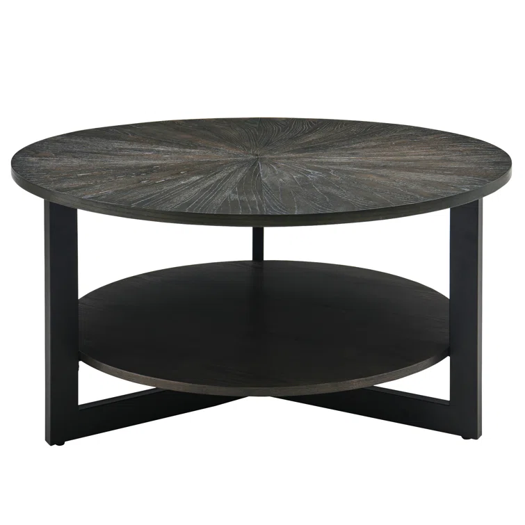 Our round coffee table provides an ideal spot to place your books, magazines, or fresh flowers with an urban industrial look. Metal legs wrap around the tabletop giving it structure and stability. Black painted metal makes up the base, with natural wood grain finish detailing on the solid wood table top surface, for an overall rustic appeal perfect for your living room.