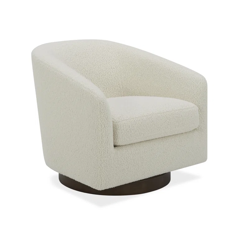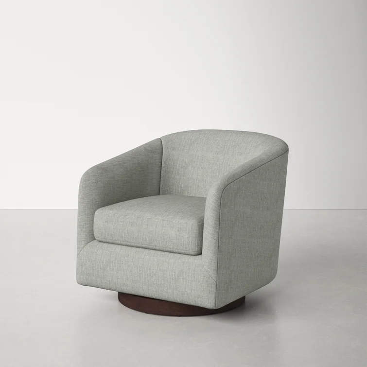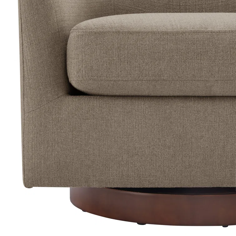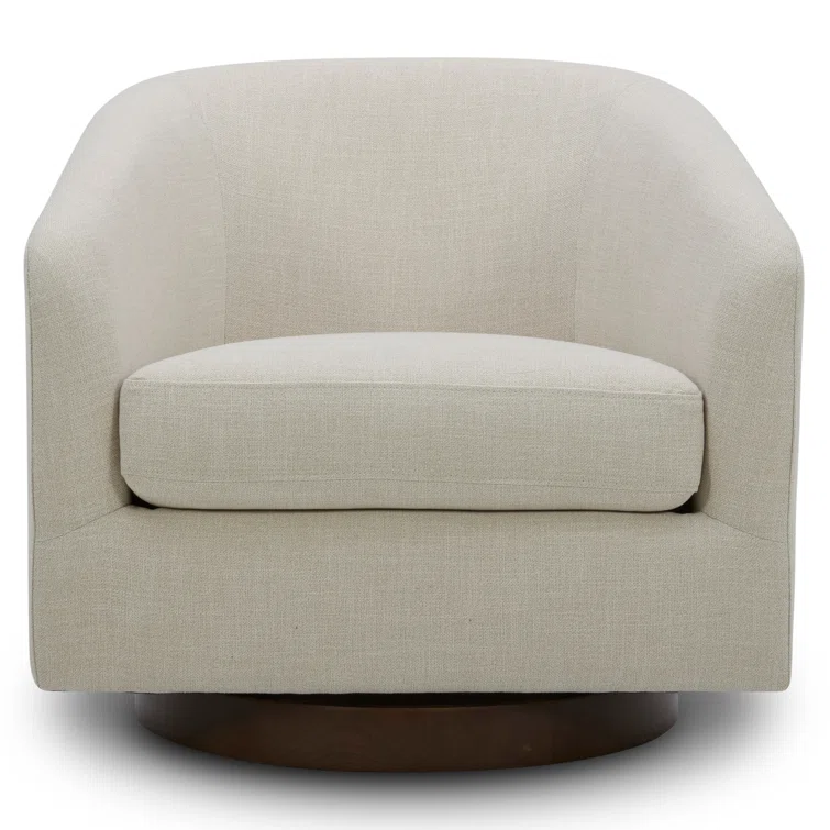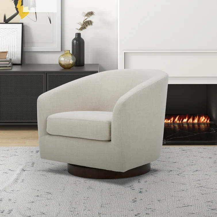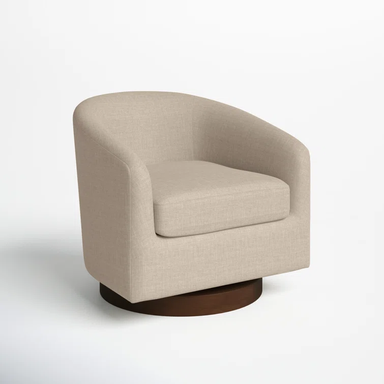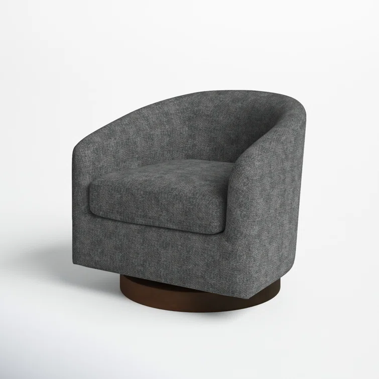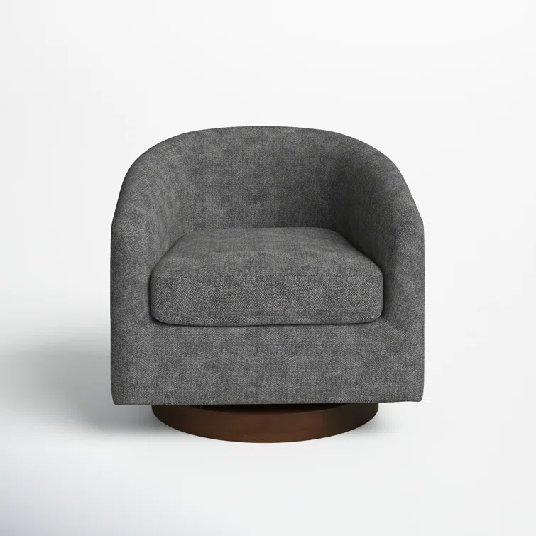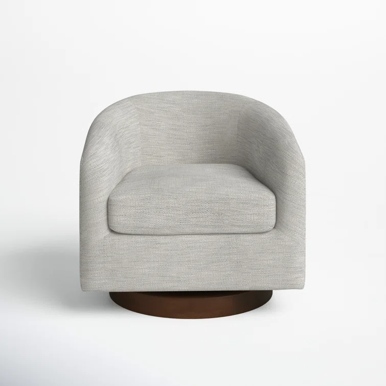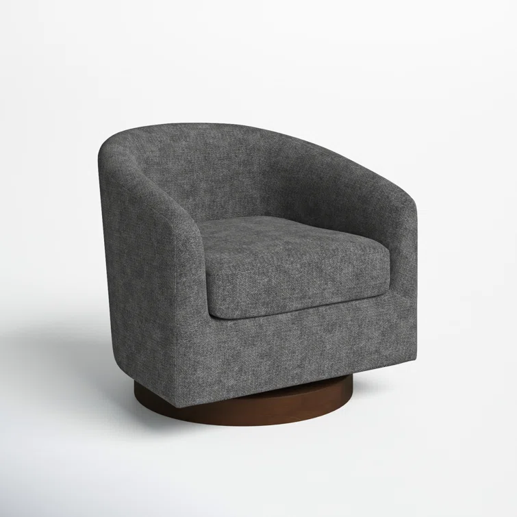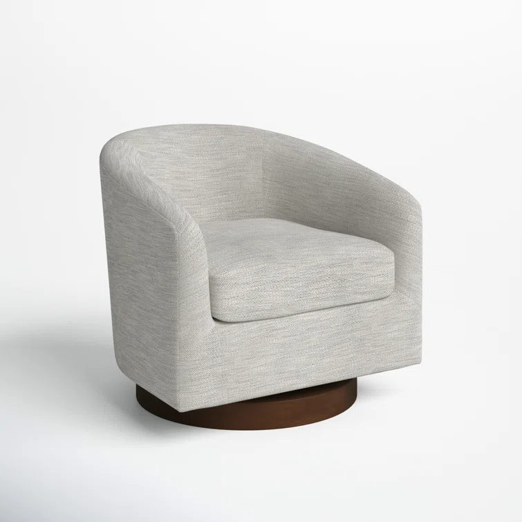 Modern momentum. This barrel chair pairs a curving silhouette with a convenient 360° swiveling function. Crafted from solid and engineered wood, its frame features a tight back that slopes into the arms for a contoured feel. We love that the web suspension is layered in high-density foam for comfort and support, all wrapped in tear-resistant upholstery available in a wide range of hues and fabrics. Bonus: The seat cushion has a removable cover with a zipper closure for easy cleaning. It has a weight capacity of 300 lbs.