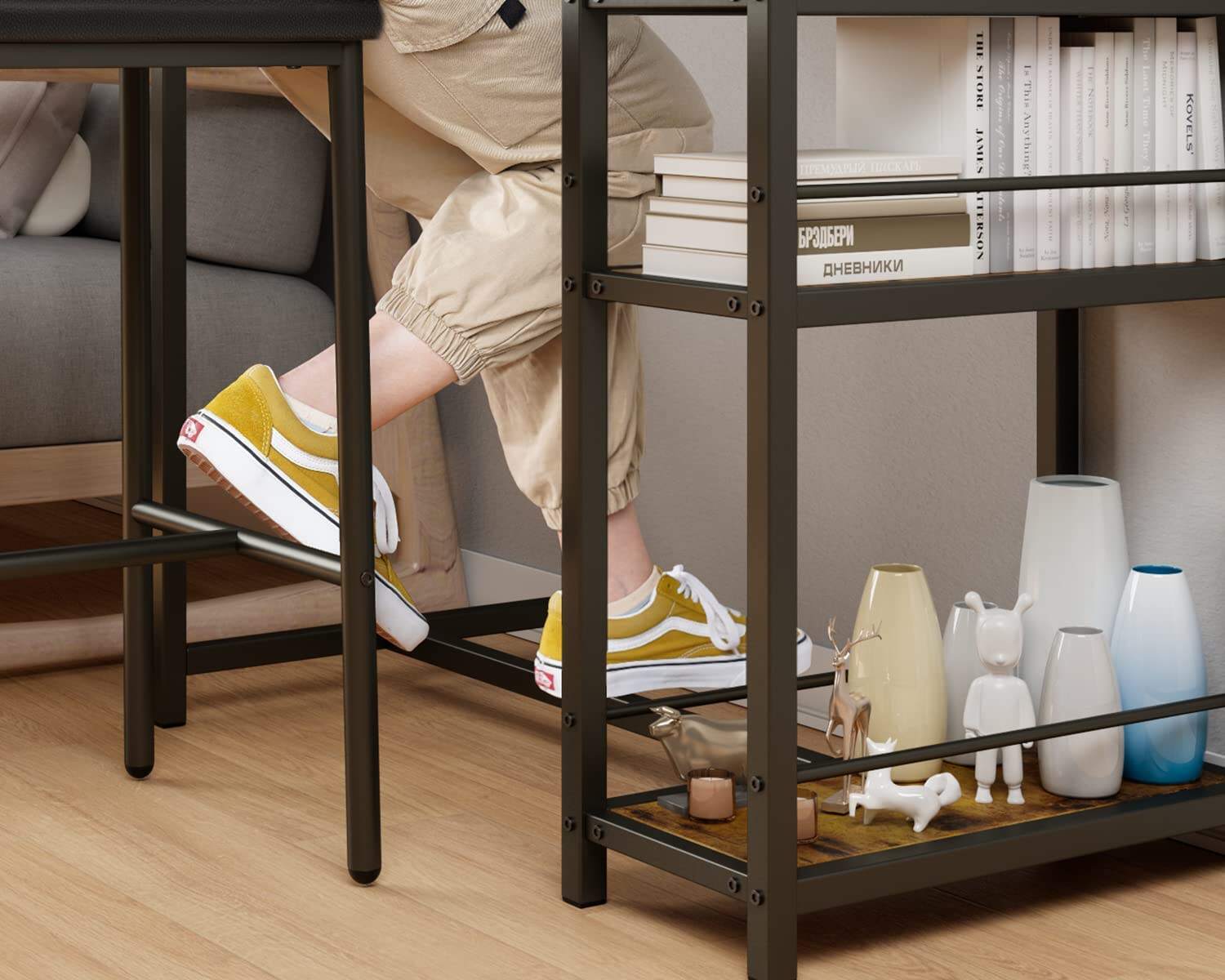 Bar Table and Chairs Set for 2 with 3 Storage Shelves, Kitchen Counter Height Dining Table Set with Pu Cushion Chairs & Thick Wood Top for Breakfast, 3-Piece Modern Pub Table Set