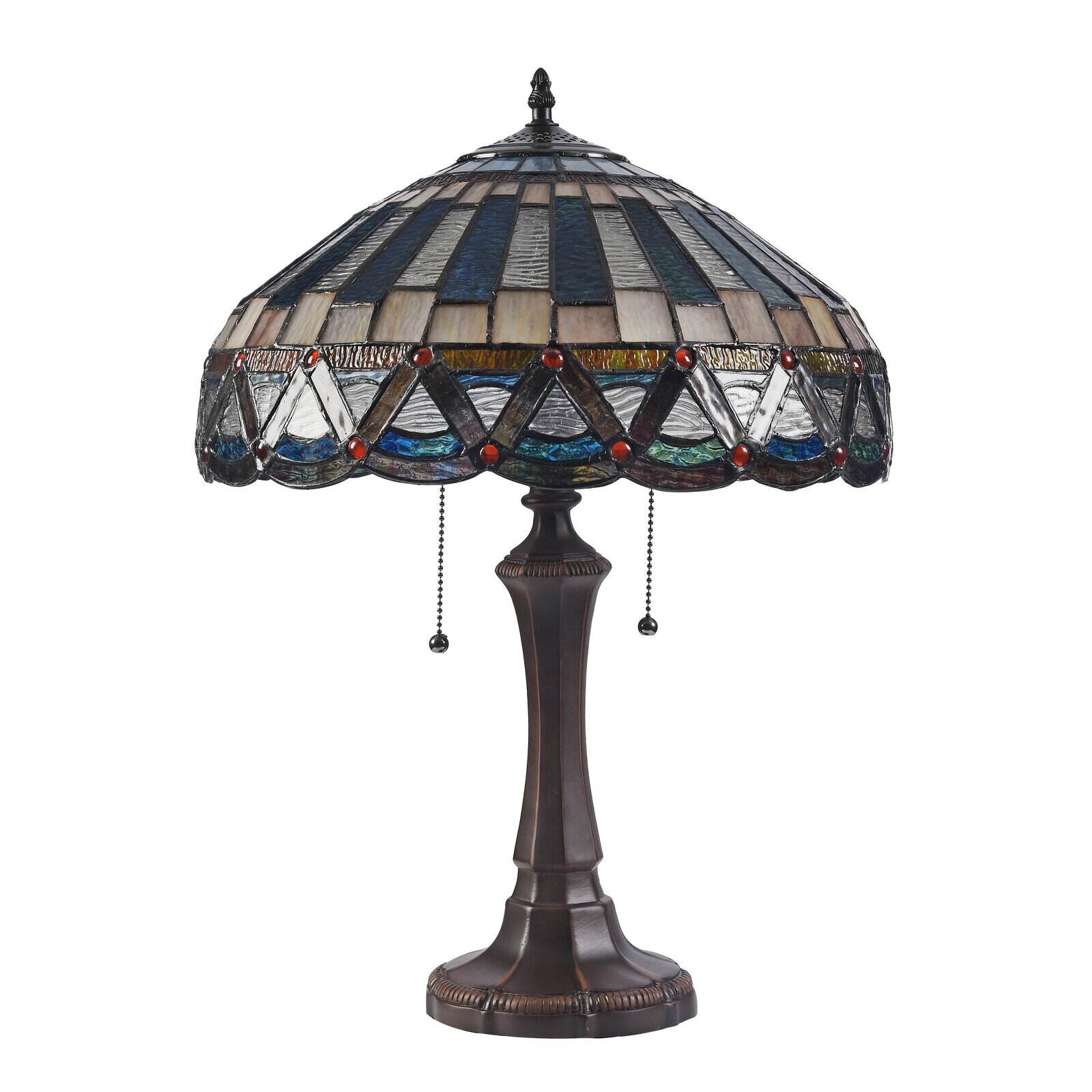 A mission style 2 light lable lamp features a stained and hand-cut glass shade, that will bring an old-fashioned feel to your home. Hand crafted from over 285 pieces of art glass and 36 glass beads. Main colors are blue and brown. Handcrafted using the same techniques that were developed by Louis Comfort Tiffany in the early 1900s, this beautiful Tiffany-style piece contains hand-cut pieces of stained glass, each wrapped in fine copper foil.