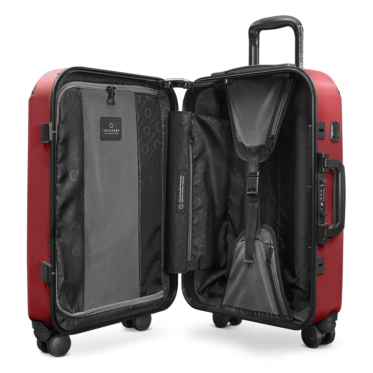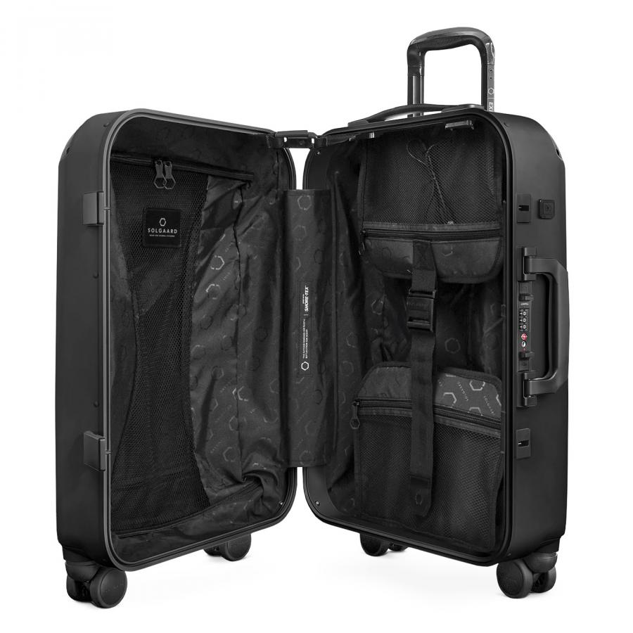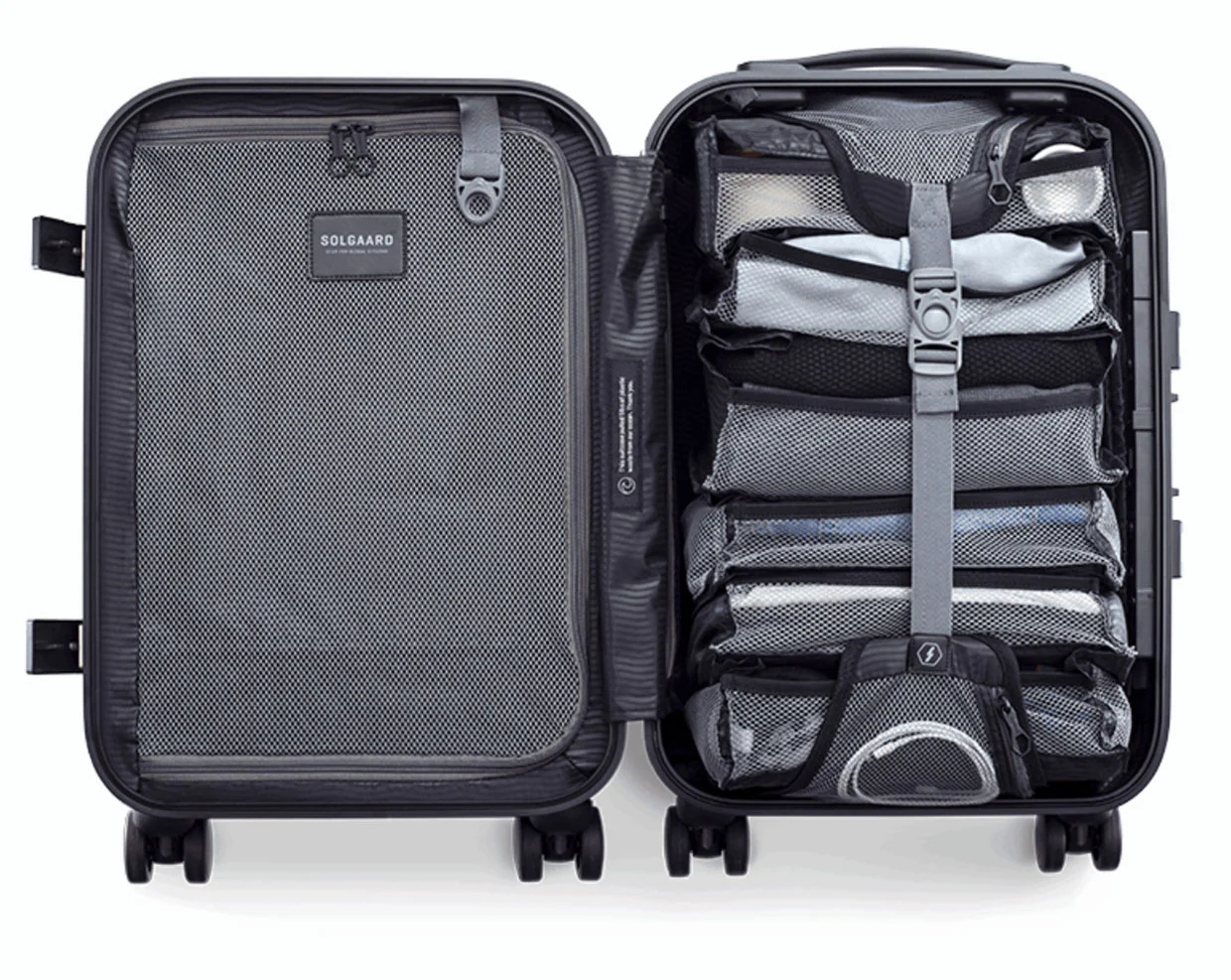 ingenious carry-on suitcase lets you travel without unpacking. It has a shelving system that expands to provide access to folded garments. The closet section can also be hung in a hotel closet. Its hardshell case is made from recycled ocean plastic and comes in 39L and 46L sizes.