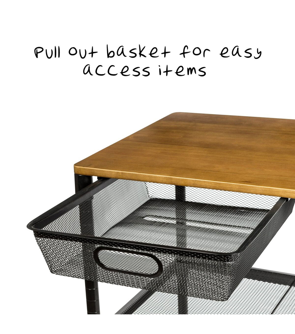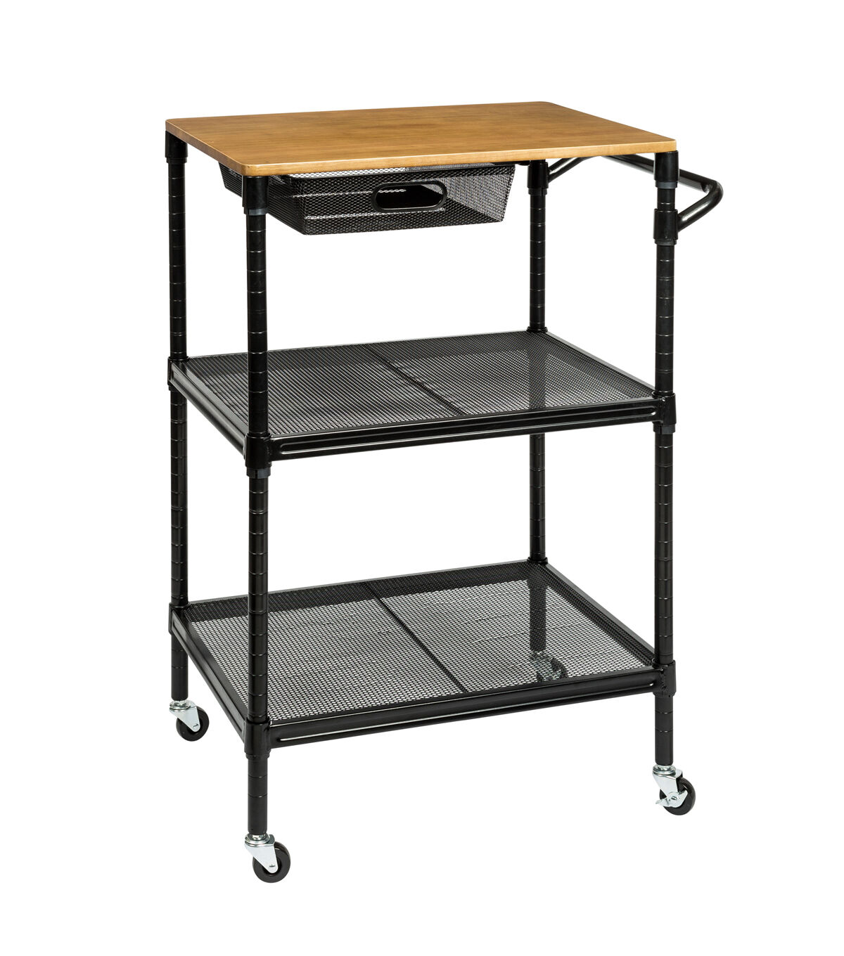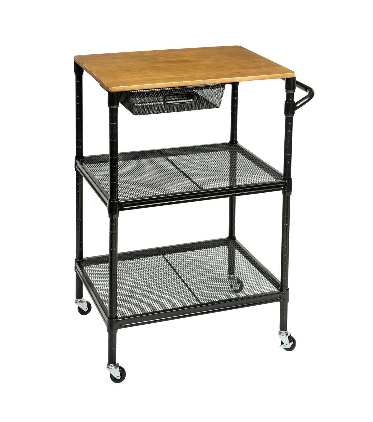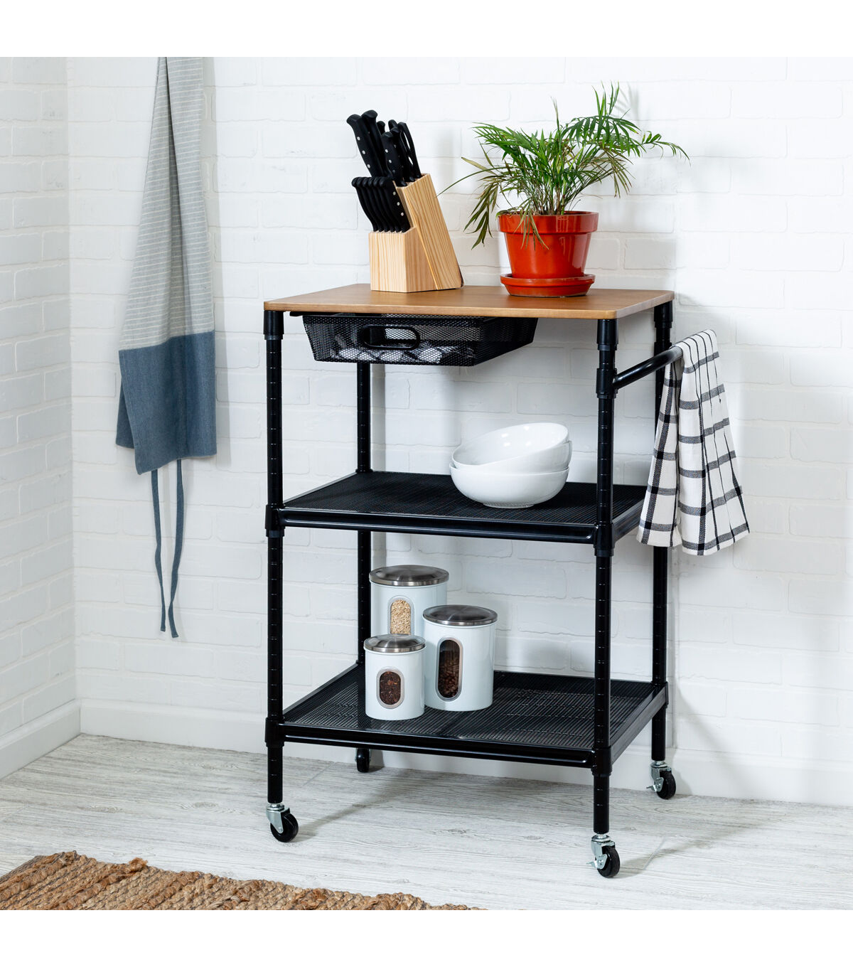 This rolling kitchen storage cart does it all. Saturday night it’s your bar cart, rolling from room to room serving guests. And when you wake up Sunday it goes back to being your cutting board when your kitchen island runs out of room. Hang towels from its adjustable bar and easily access kitchen tools from its pull-out basket. Additional storage can be found in its two bottom shelves. Go ahead, roll it around and smile.