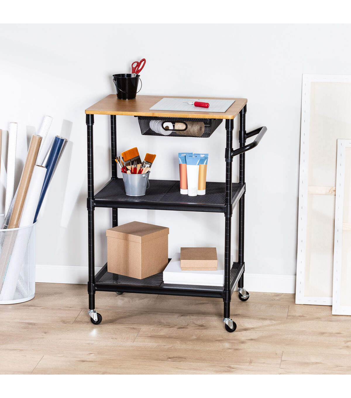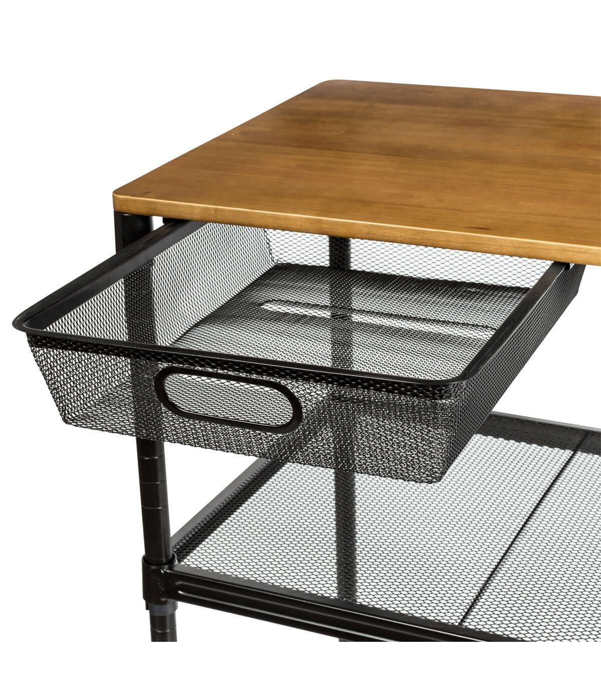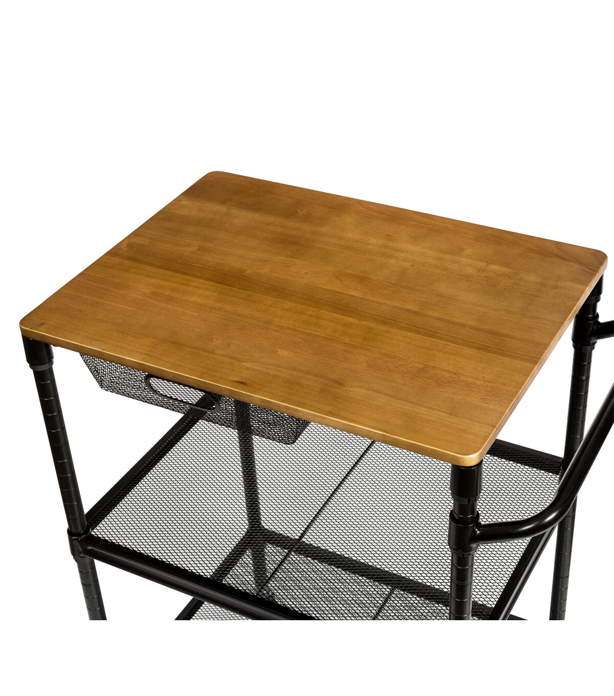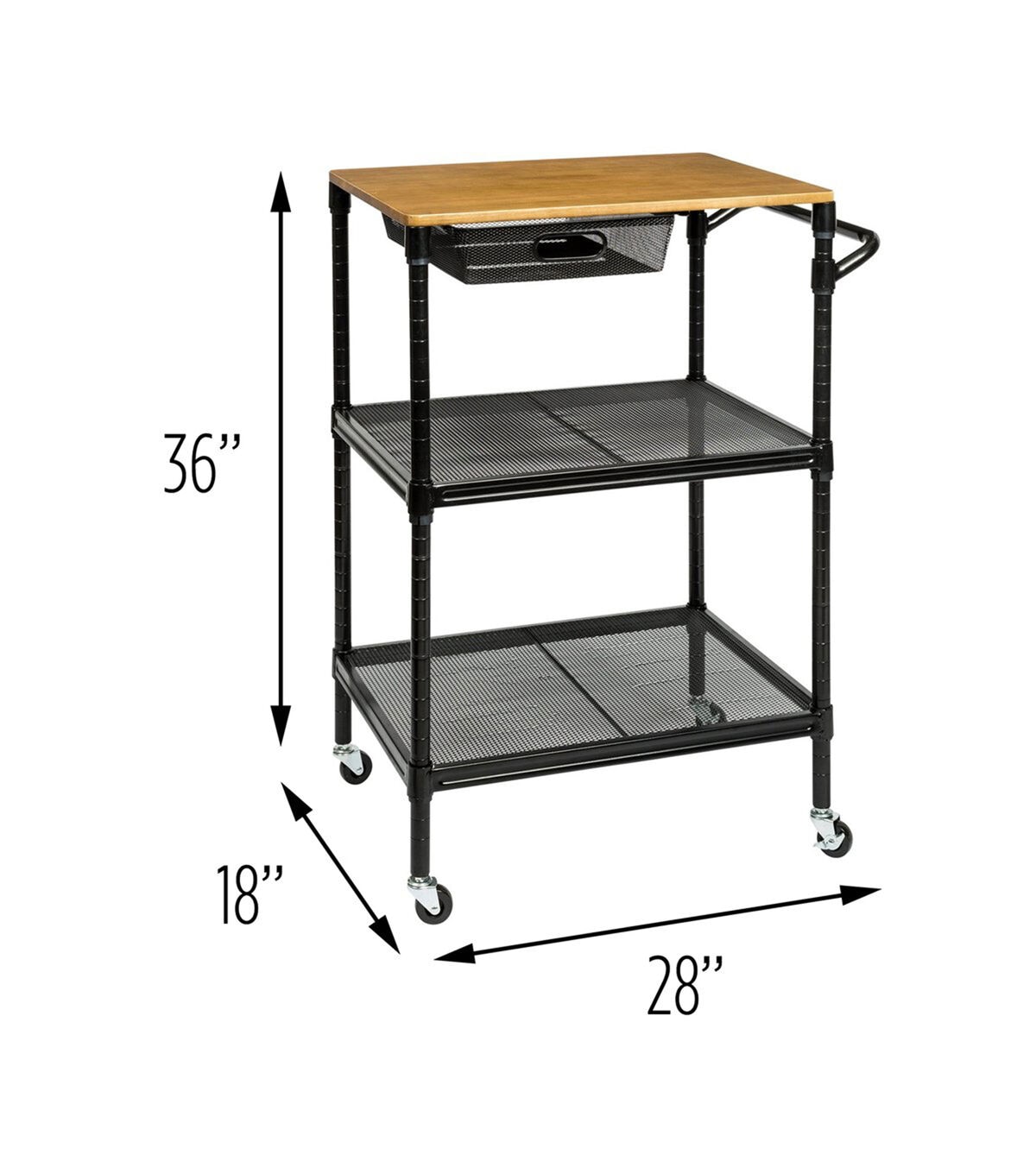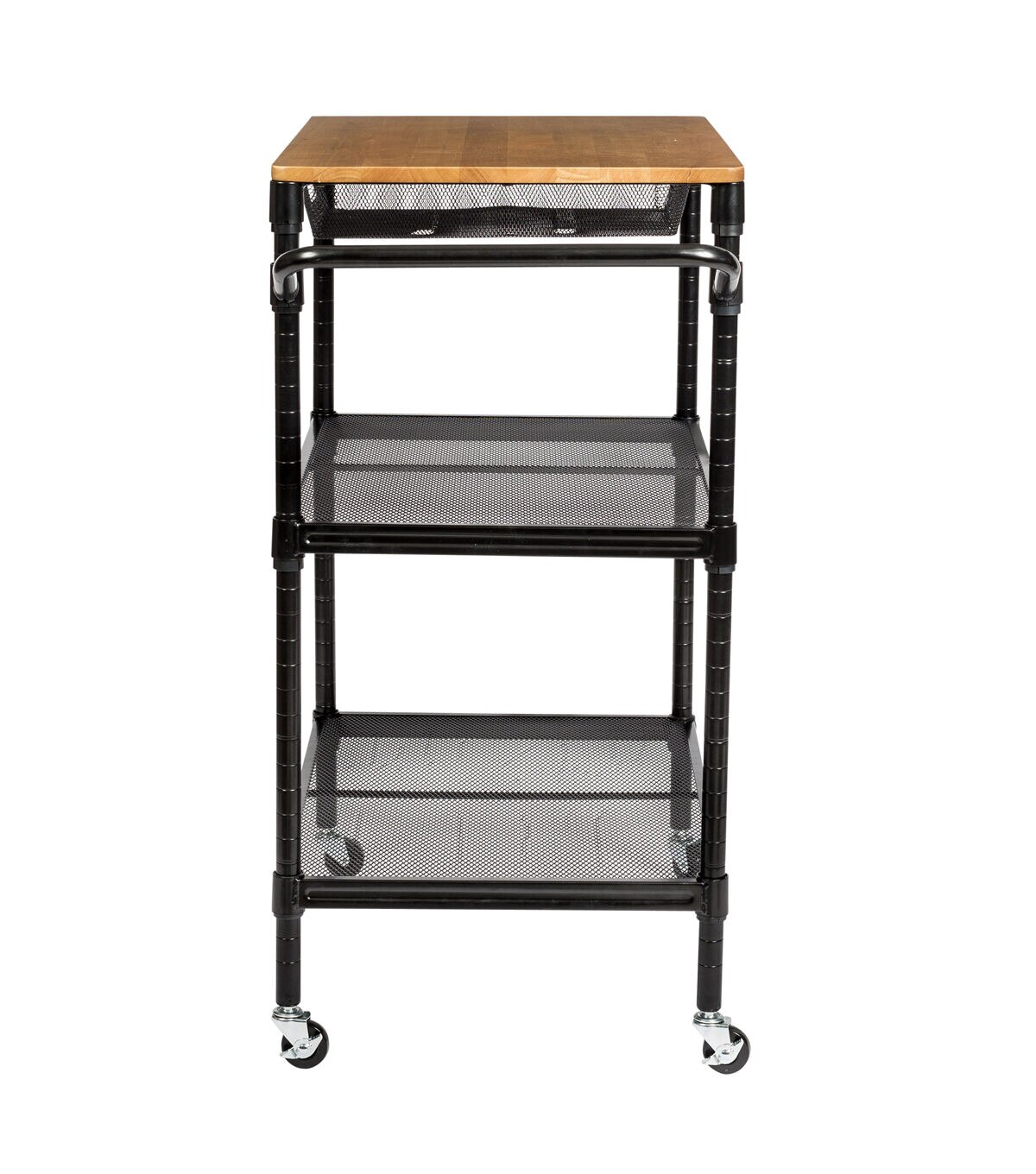 This rolling kitchen storage cart does it all. Saturday night it’s your bar cart, rolling from room to room serving guests. And when you wake up Sunday it goes back to being your cutting board when your kitchen island runs out of room. Hang towels from its adjustable bar and easily access kitchen tools from its pull-out basket. Additional storage can be found in its two bottom shelves. Go ahead, roll it around and smile.