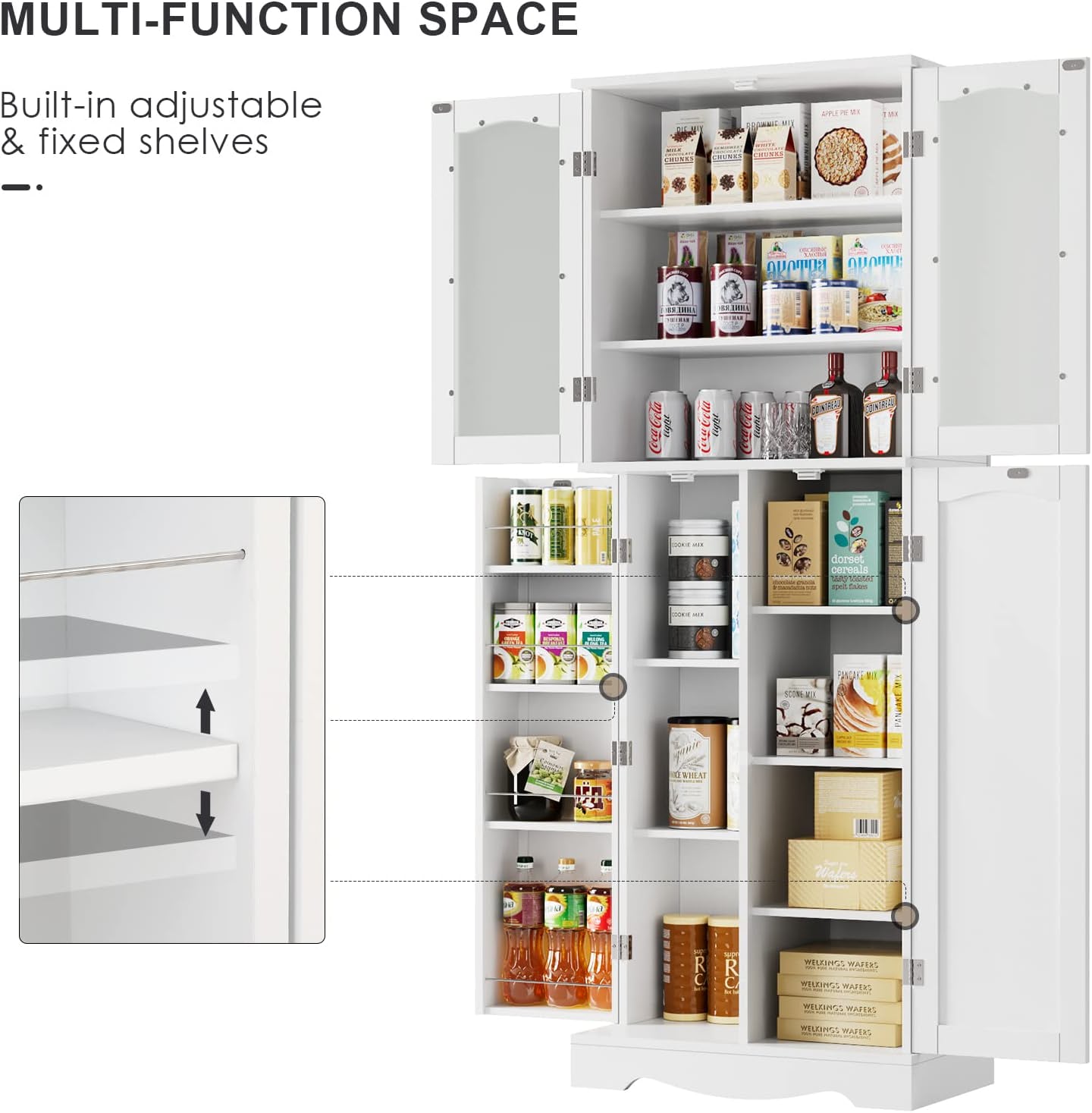 - 【Large Space Utilization】The pantry cabinet has 2 double door cabinets, you can see 10 sub-compartments when opened, and also 4 storage shelves behind the side door. Multi-layer shelves provide ample storage space for drinks, canned goods, dried pasta, oils, spices, and tableware. Now you can organize all your kitchen essentials neatly with this white food pantry
