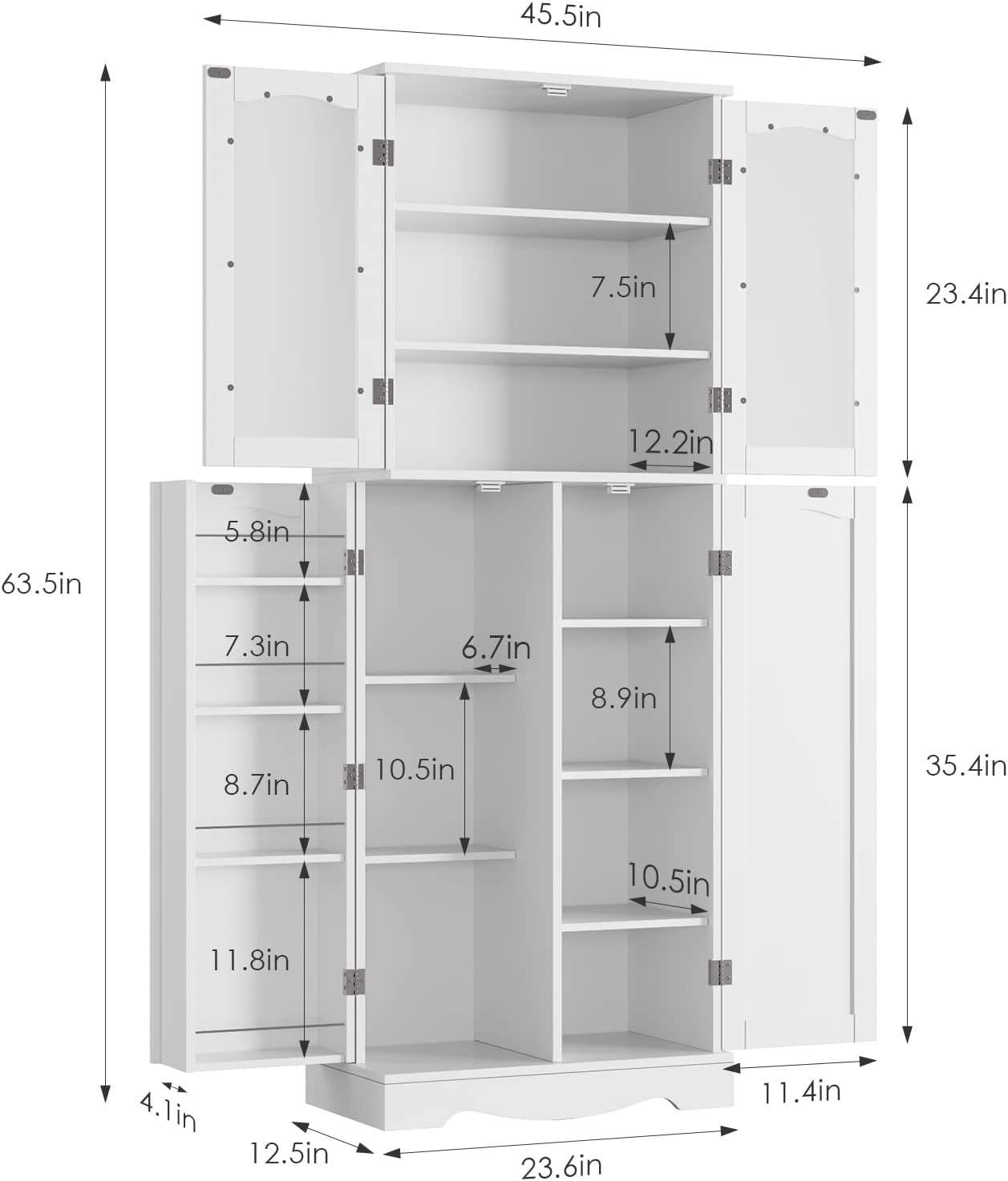 - 【Long-lasting Materials】Constructed from high-quality MDF, the tall pantry with a reinforced wall attachment for stability. With premium white paint craftsmanship, the surface is smooth, waterproof and scratch resistant. Product dimensions: 23.6"L x 12.5" D x 63.5" H