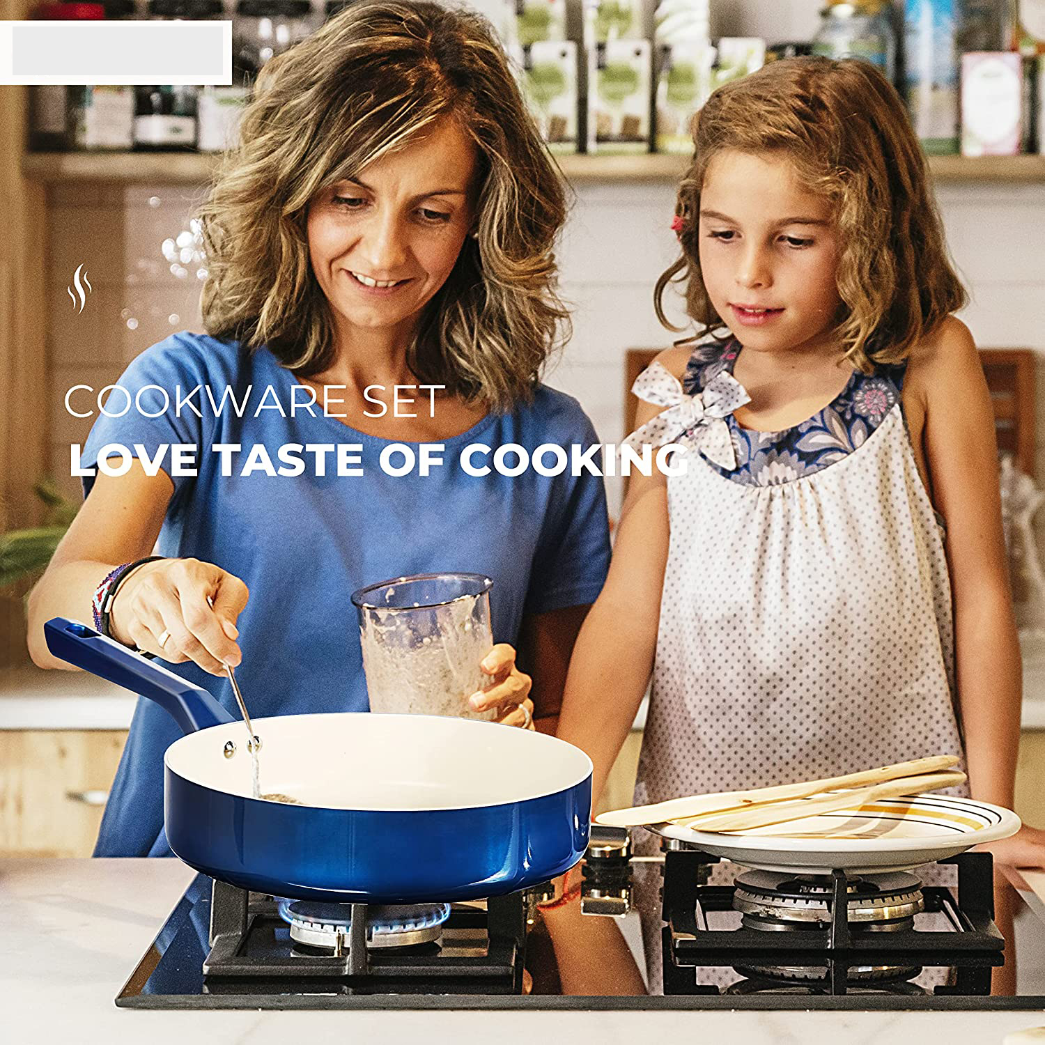 • 🍎What's inside: 8.7" and 11" Frying Pans, 10.3" Saute Pan with Lid, 1.5 QT and 2.5 QT Sauce Pots with Lids, 6.5 QT Stock pot. Perfect cookware set for all cooking from searing to simmering.