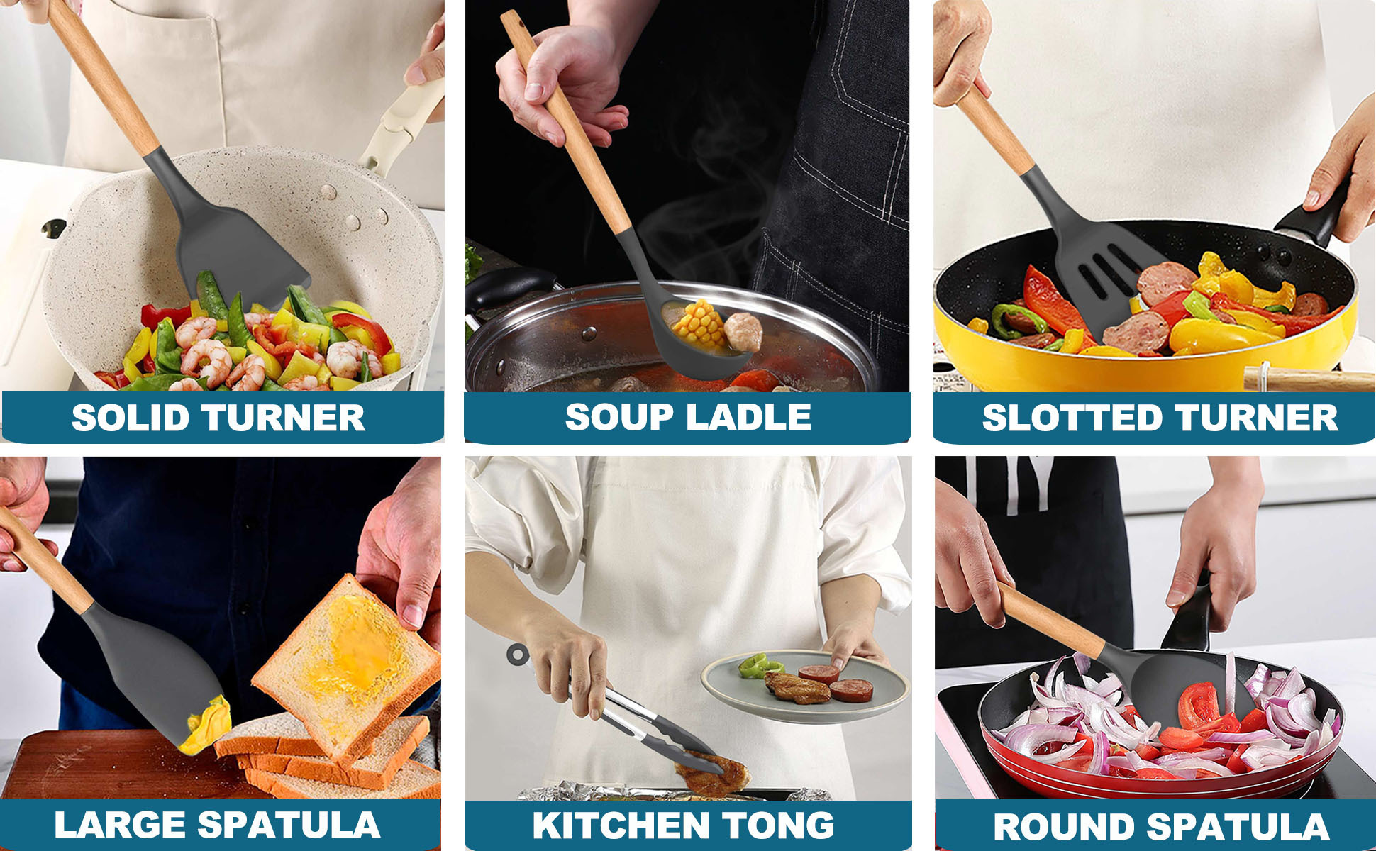 - Heat Resistant. Silicone cookware utensils set can withstand high temperature up to 446?oF. they would not melt at high temperature cooking like frying or touching hot pans. Ergonomic wooden handle can effectively block the heat transfer to prevent the chefa??s hands from scalding during cooking