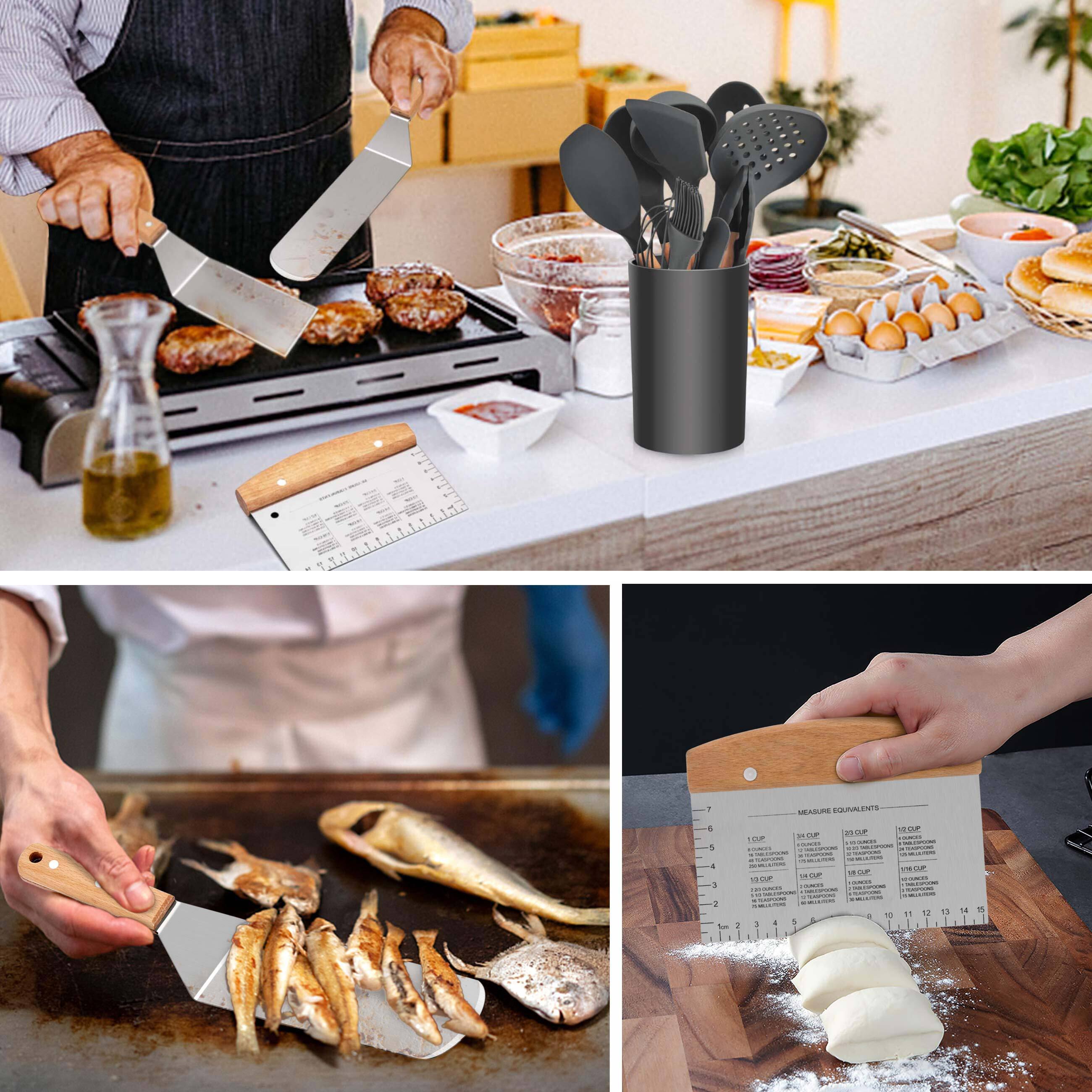 - Attach Metal Spatula. Plus metal cooking spatula turner. long spatula and dough scraper. Smooth matt finish surface reduce food sticking. Angle with sharp and beveled edge help flipping and cutting foods efficiently. Sturdy triple rivets handle will not loose or come apart. Great for your daily cooking. baking pancakes. frying steak. grilled fish. cutting cookie dough. chopping salad and vegetables and more