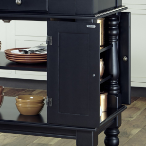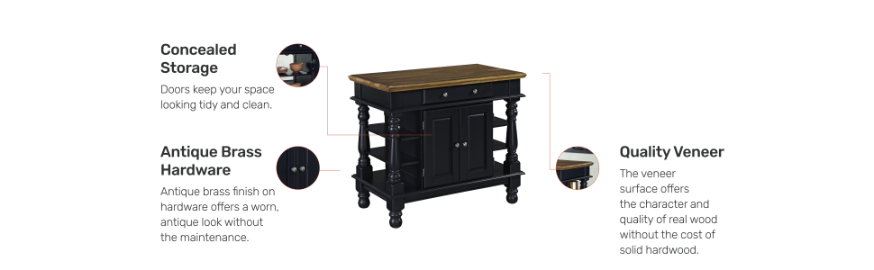Offering space to prep for meals, set out appetizers at parties, and stow cooking supplies, this classic cart is a must-have for your kitchen. Founded atop four bun feet connected to turned legs, its frame is crafted of solid hardwood and veneers with engineered woods and offers a versatile solid finish. Plus, its top drawer, two interior shelves accessed by cabinet doors on either side and six exterior shelves offer enough space for all your organizational needs.