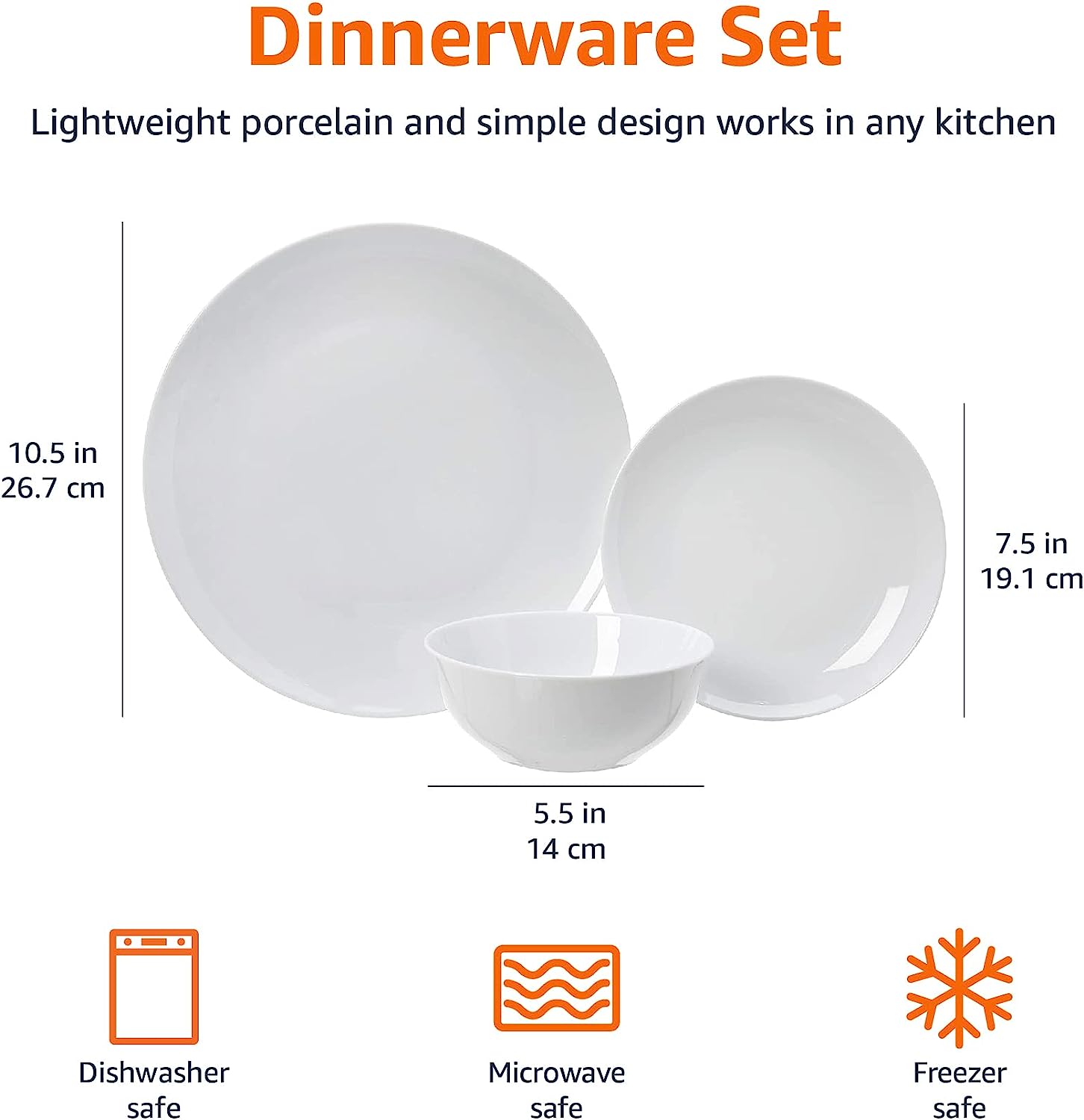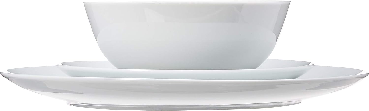 • Basics 18-Piece Kitchen Dinnerware Set, Plates, Dishes, Bowls, Service for 6, White Porcelain Coupe