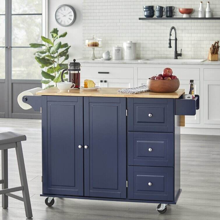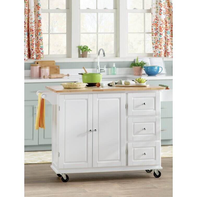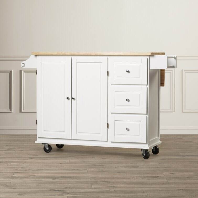 This rolling cart is the right piece for adding extra chopping, cooking, and serving space in your kitchen. Crafted from engineered wood with the finish of your choice, this cart showcases three drawers and a single cabinet that are ideal for storing away cutlery, napkins, and cooking pots. We love how the inset paneling on the fronts give this piece a traditional look. This cart features a light brown solid wood countertop with a drop-down leaf that adds additional surface space. It also comes with a built-in rack on the side for towels and utensils. Plus, this cart rests on four removable casters (two are lockable), so it can be moved with ease.