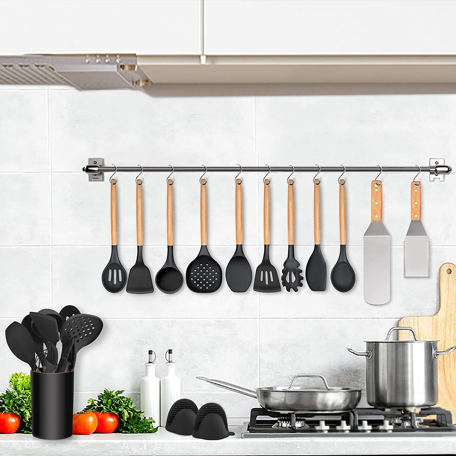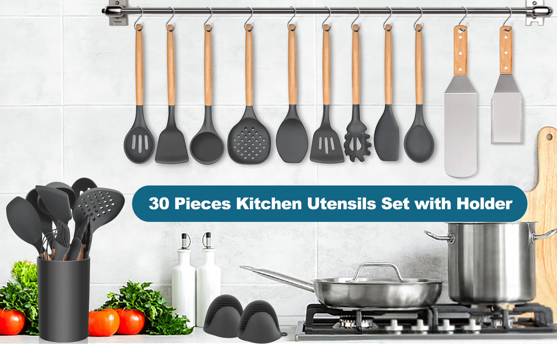 Complete Cooking Utensils, This professional set is the most complete set containing different cooking utensils to satisfy your various cooking needs, includes turner, slotted turner, spoon, slotted spoon, skimmer, soup Ladle, spoonula, pasta server, tongs, spatula scraper, spatula, spreader spatula, whisk, basting brush, metal cooking spatula, metal long spatula, dough chopper, oven mitts, 10 x hooks and utensil holder