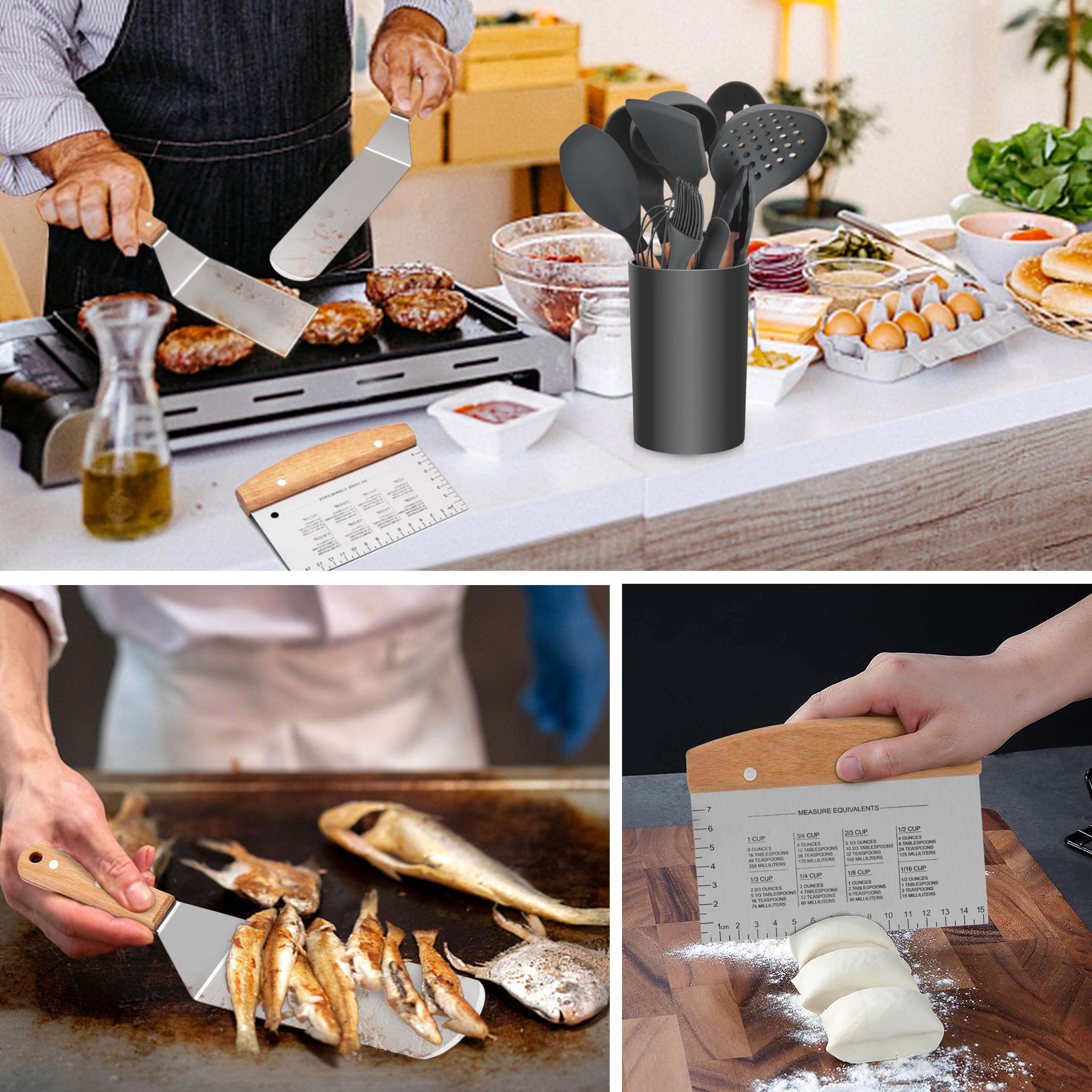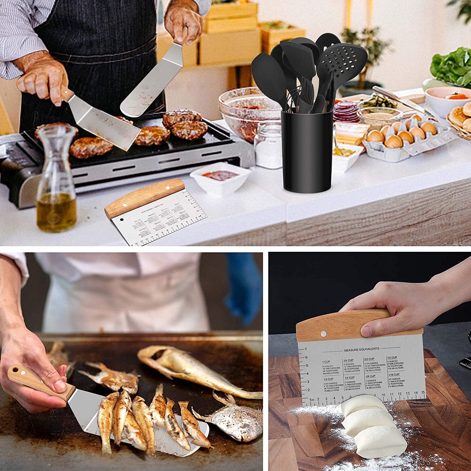 Attach Metal Spatula, Plus metal cooking spatula turner, long spatula and dough scraper, Smooth matt finish surface reduce food sticking, Angle with sharp and beveled edge help flipping and cutting foods efficiently, Sturdy triple rivets handle will not loose or come apart, Great for your daily cooking, baking pancakes, frying steak, grilled fish, cutting cookie dough, chopping salad and vegetables and more