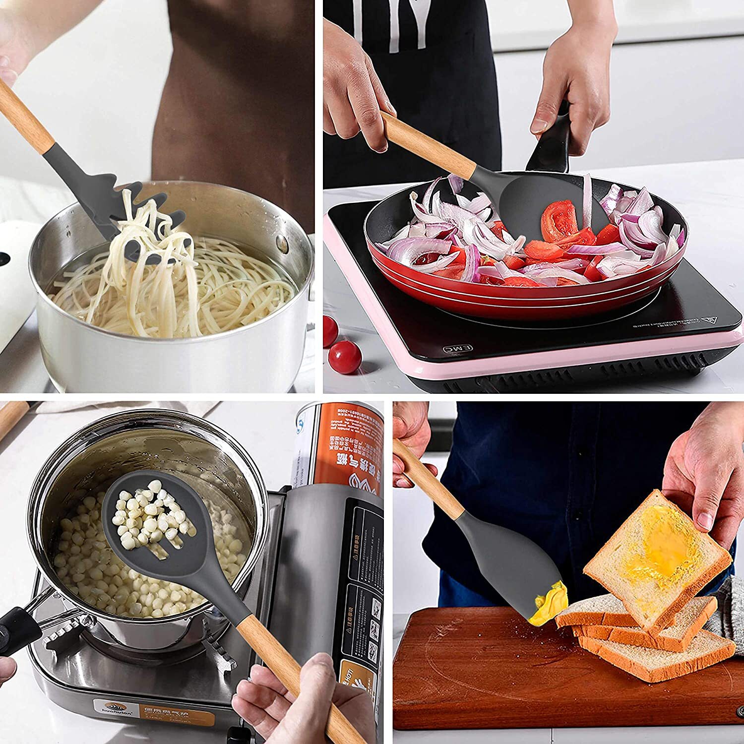 Heat Resistant, Silicone cookware utensils set can withstand high temperature up to 446ºF, they would not melt at high temperature cooking like frying or touching hot pans, Ergonomic wooden handle can effectively block the heat transfer to prevent the chef’s hands from scalding during cooking