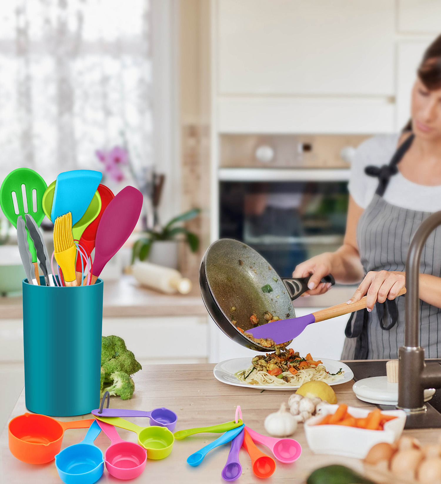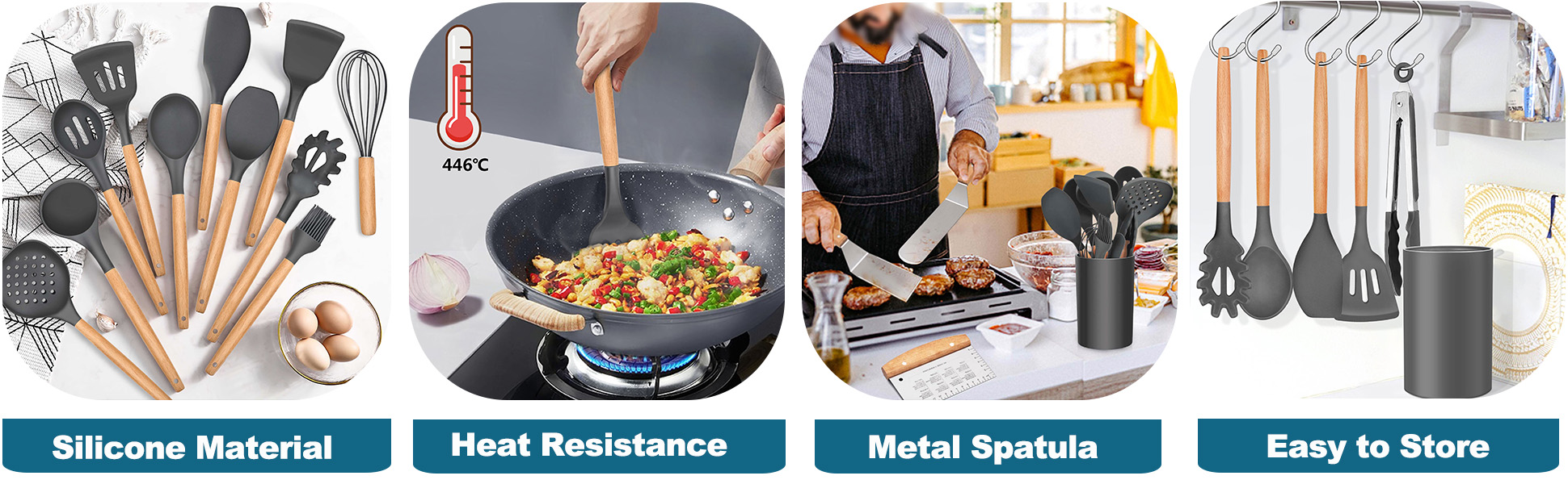 Premium Quality, Our silicone utensils are made of superior food grade silicone without any harmful material, Would not react with foods or produce toxic odor during cooking, safe and healthy for your family daily cooking, Soft silicone head protect your nonstick cookware and pans from scratches or damage, Metal spatulas are crafted of high quality stainless steel, rust resistant and corrosion resistant to extend lifetime