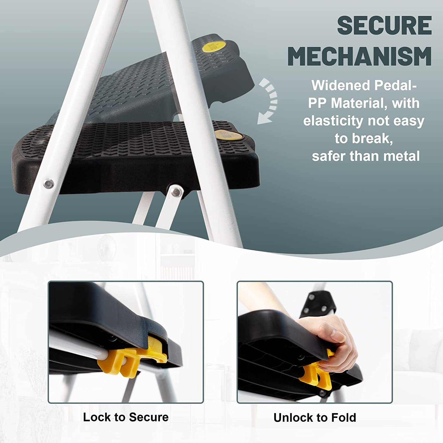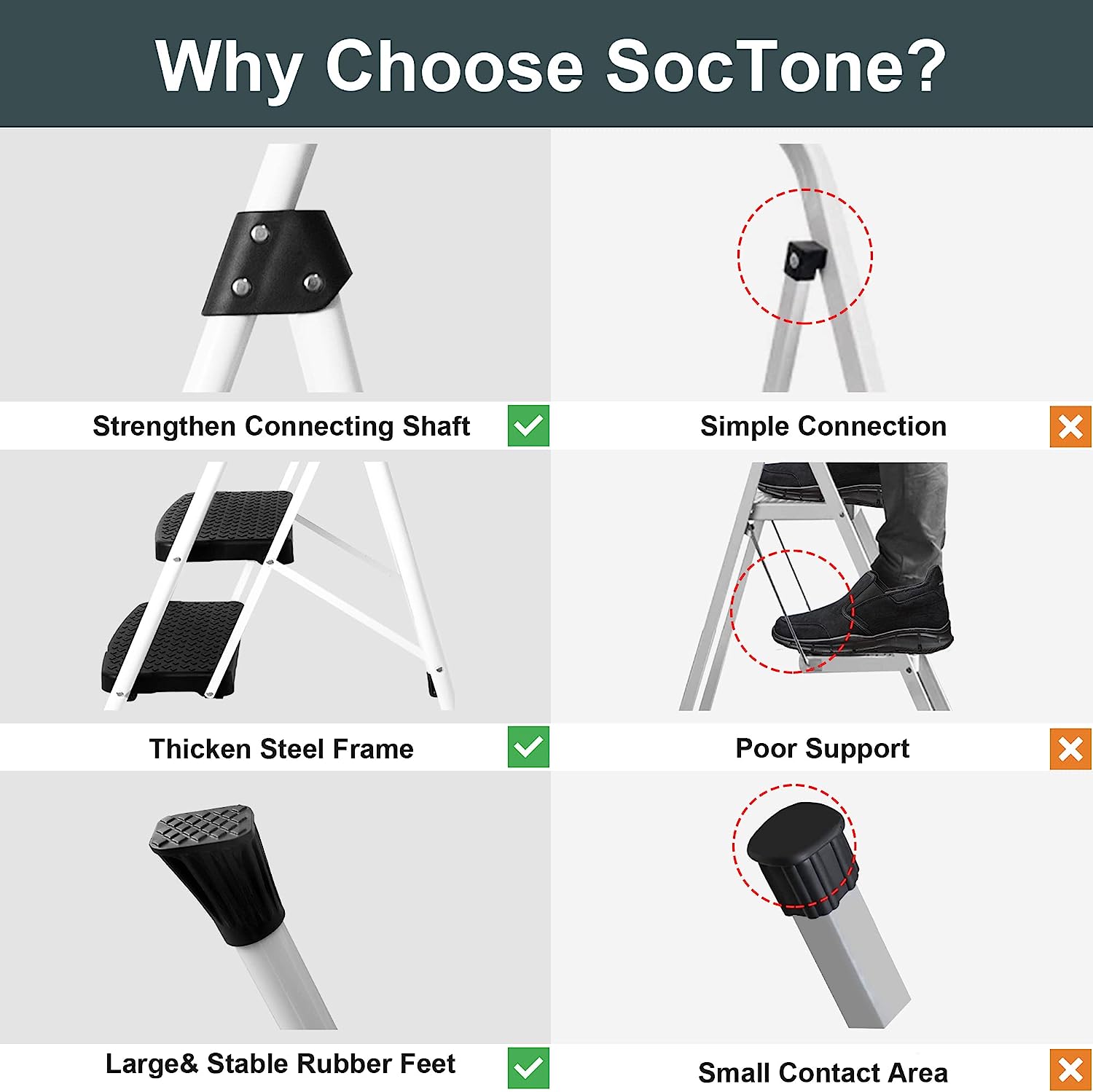 SECURITY& STABILITY UPGRADE - SocTone 3 step ladder added metal support and thickened the steel frame, and used safety lock design to fix the ladder. When you use it, simply push down the top pedal until the safety locking mechanism is automatically locked in place. Rust-resistant steel frame with safety locking mechanism, strong and reliable structure.