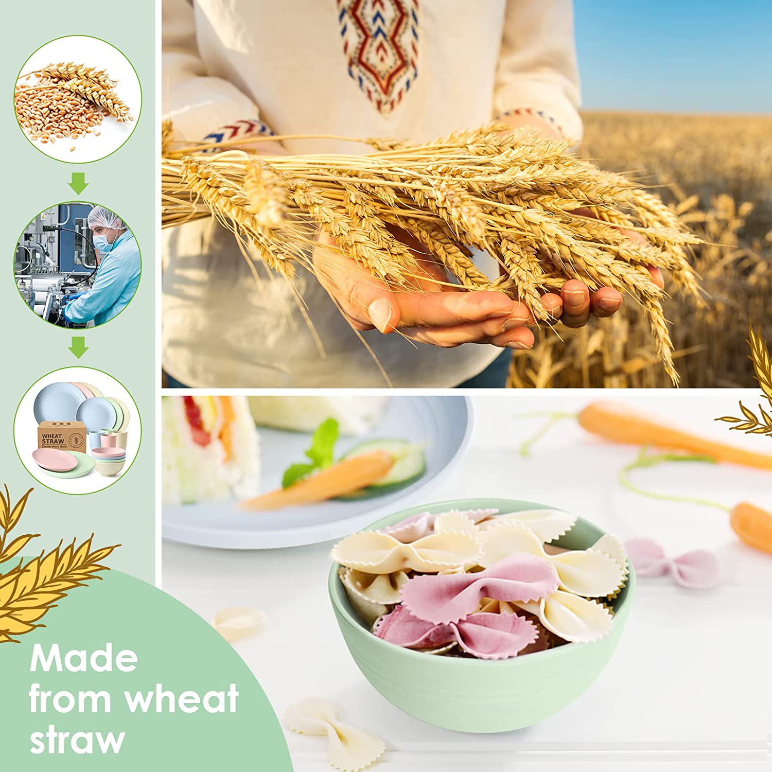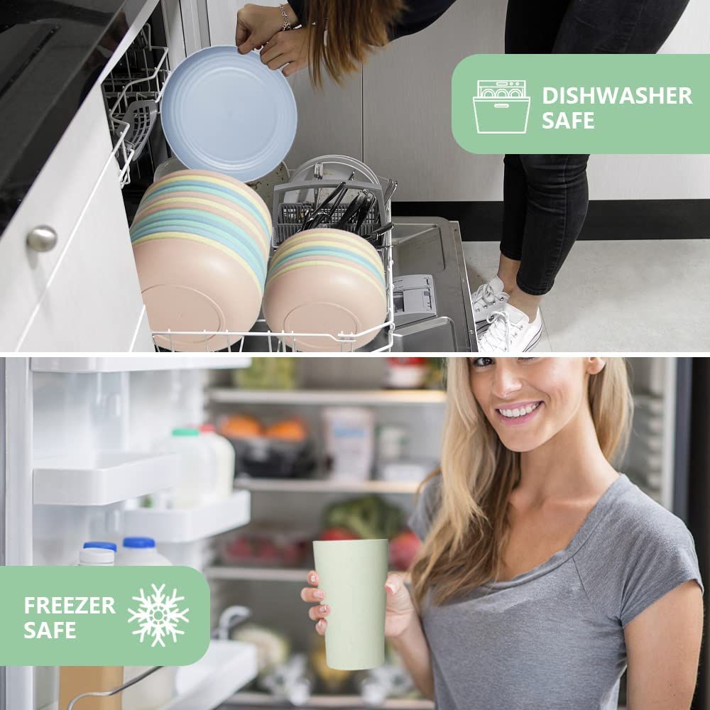 - MATERIAL: Made of natural wheat straw and food grade PP material. Safe and healthy for everyone to use. Provides a healthy and sustainable alternative to foam or plastic products.