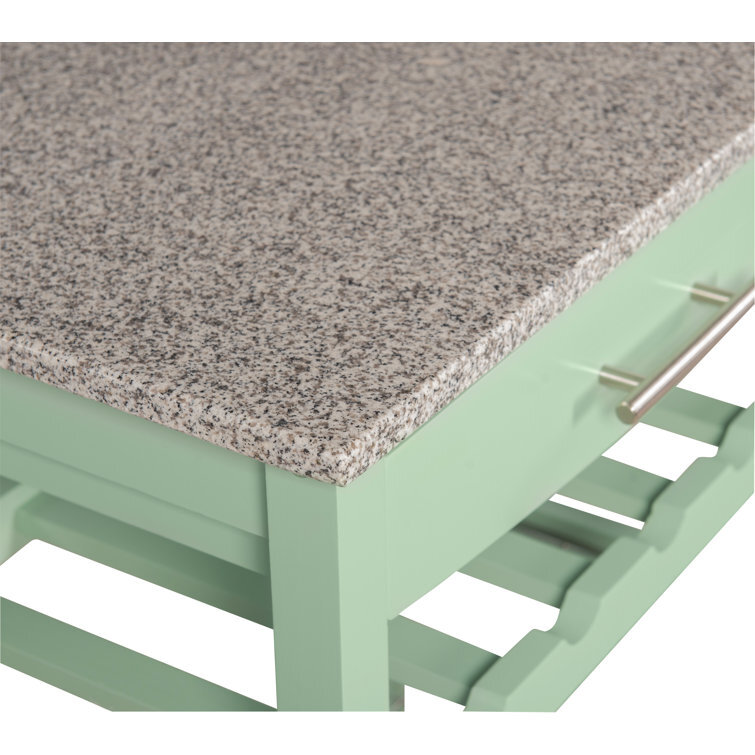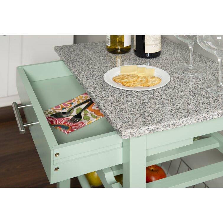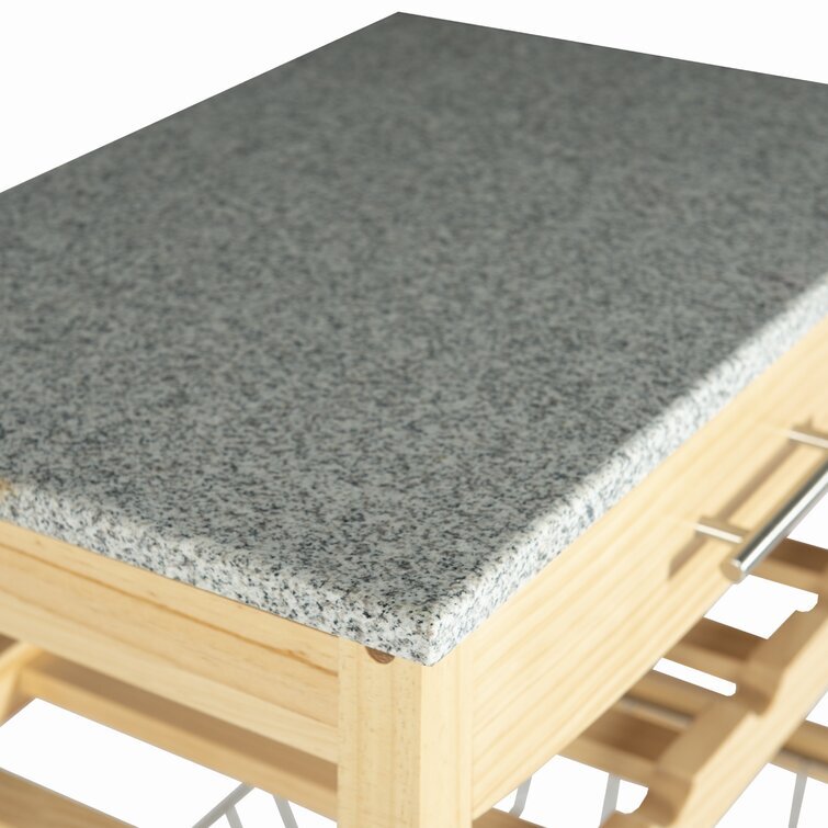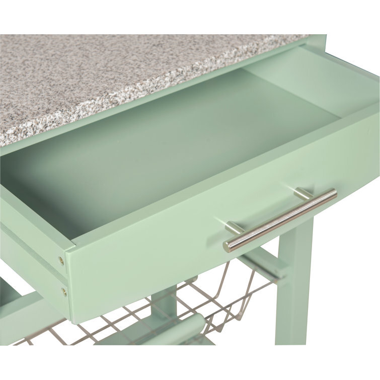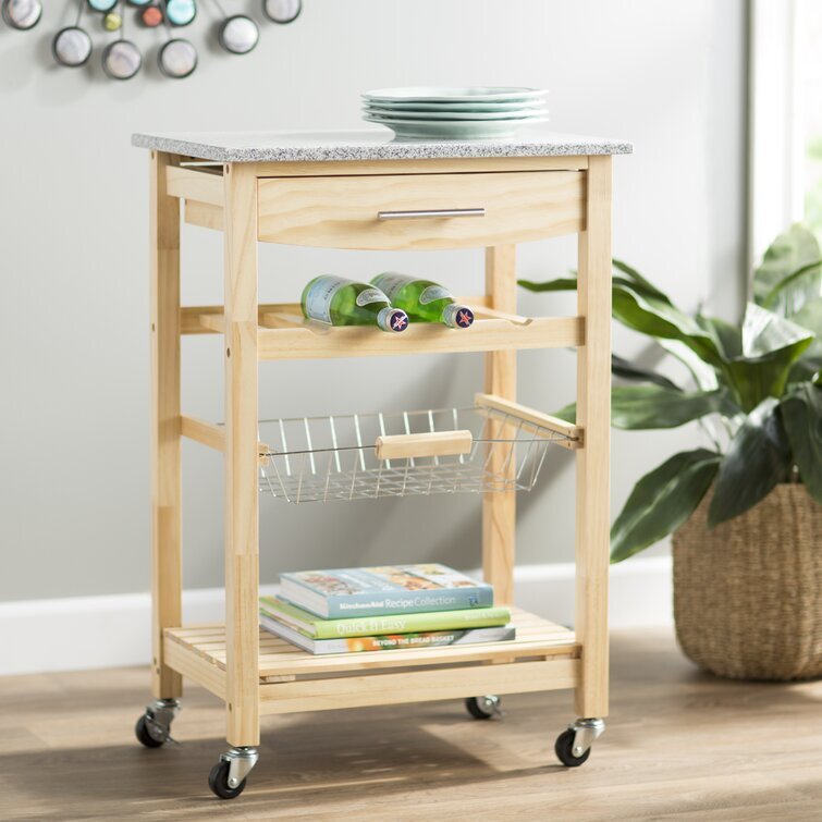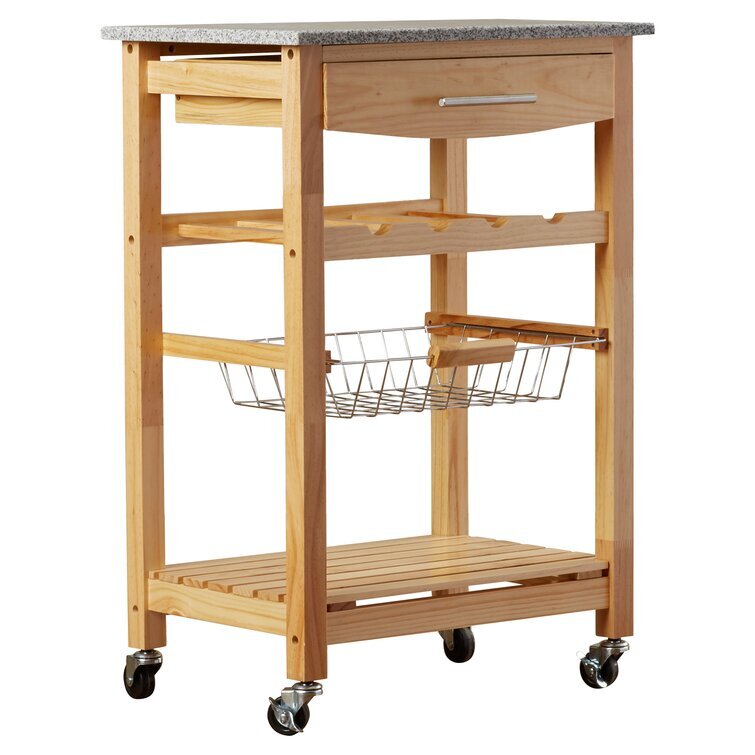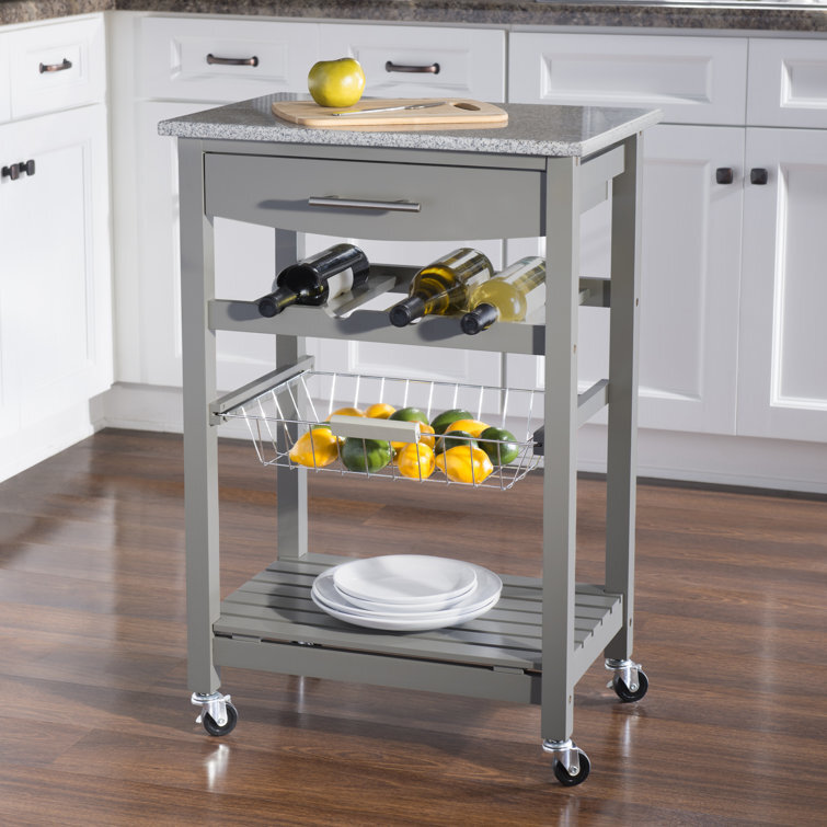 Perfect for adding much-needed prep space and storage, a cart like this is a great option for making the most of spare square footage in your kitchen. Crafted from solid and manufactured wood and capped with a granite surface, this piece features an understated look at home in a variety of kitchen styles. The bottom of this cart features a wine rack, metal basket, and shelf perfect for clearing away cooking clutter. A single drawer with a bar pulls rounds out this piece's storage options. And with locking wheels, it's easily moved wherever it's needed most.